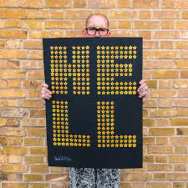 ‘HELL’ pops out from the black background in the form of Bright Yellow, Orange and Red hand formed stars which is a variation to the usual block letters, colours and repeat patterns. The 3D Effect is more pronounced with hand finished trickled varnish making each one of the Edition an Individual print.