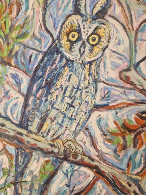 By Billy Childish. This is a painting of a Reunion Owl was Billys Contribution to the plight of endangered and extinct birds.