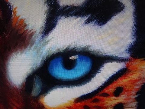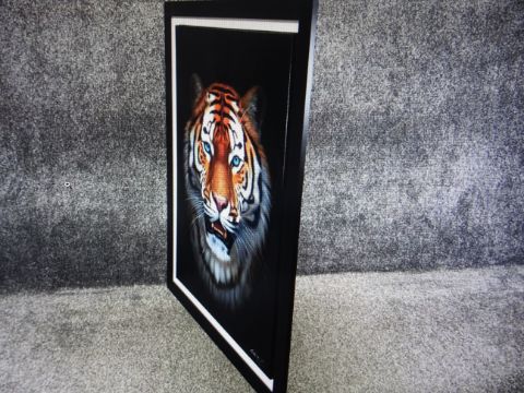 A black framed original oil painting by the artist Ghesquiere titled "Tigre". Approx  120cm height,  90cm width. This painting has been valued at 4300.00 euros by the Alliance European Des Experts. New and still in its original packaging. Slight markings at the back as shown but does not affect the art.