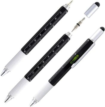 Multifunctional pen with 6 functions: ruler, spirit level, pen (0.7 mm black ink), touch screen stylus, flat head screwdriver and cross.