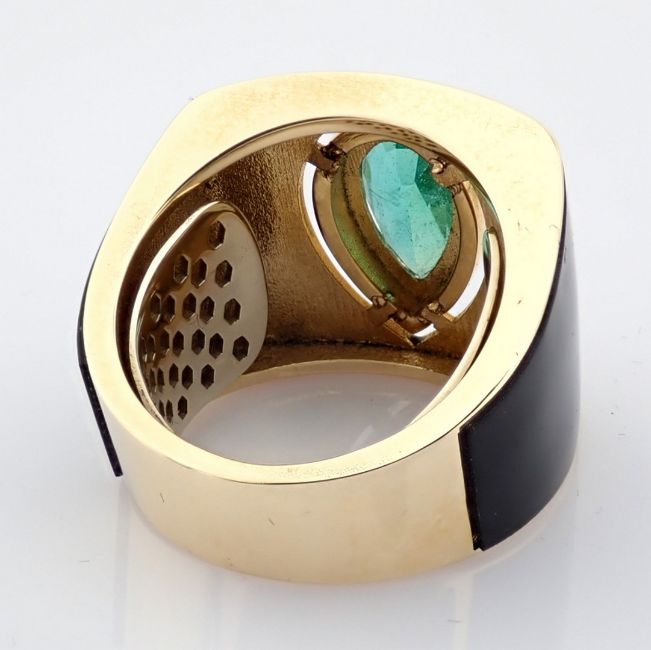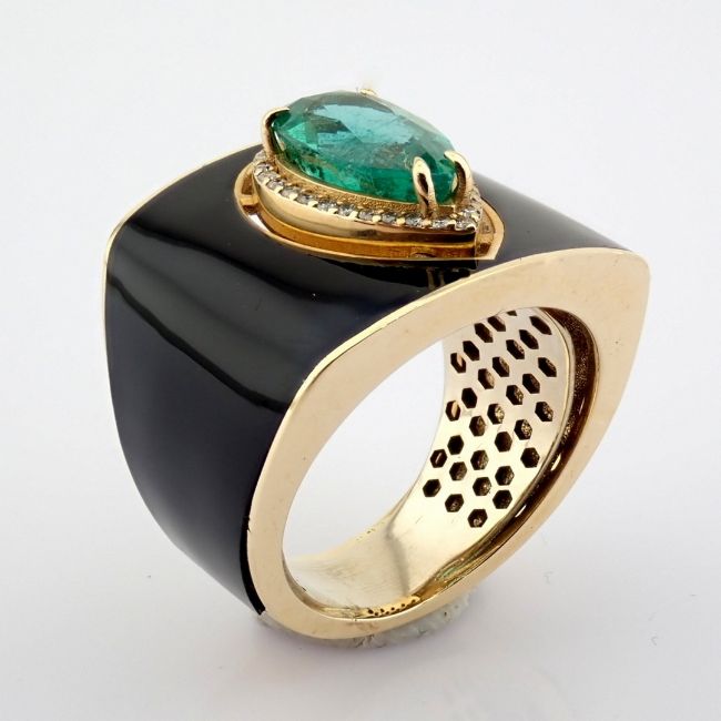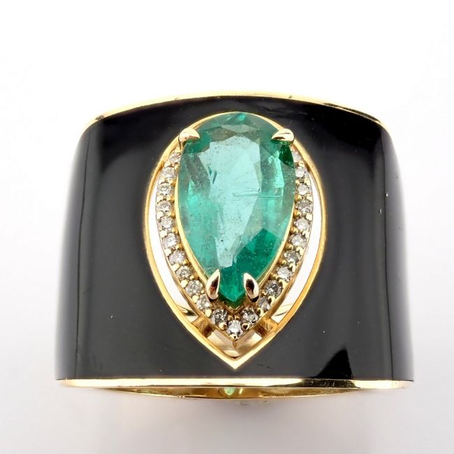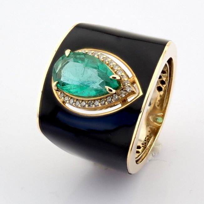 - A luxurious gold ring featuring black laser enamel, elegantly adorned with vibrant 2.14 ct Emerald and brilliant diamonds--------------------------------------------------