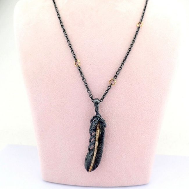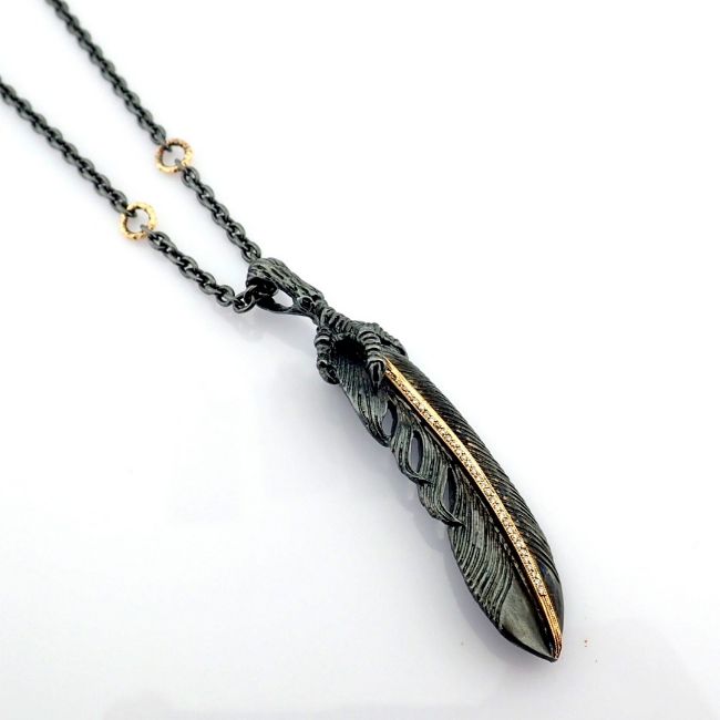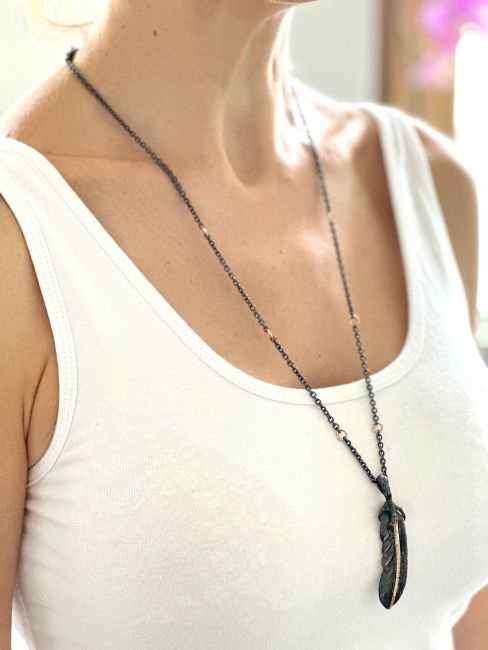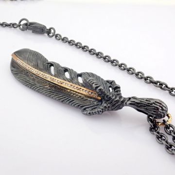 Feather necklace detailed with brilliant diamonds and gold on silver--------------------------------------------------