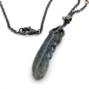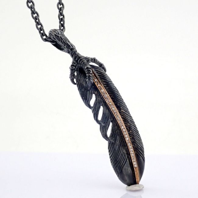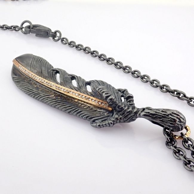 Title: Feather necklace detailed with brilliant diamonds and gold on silver