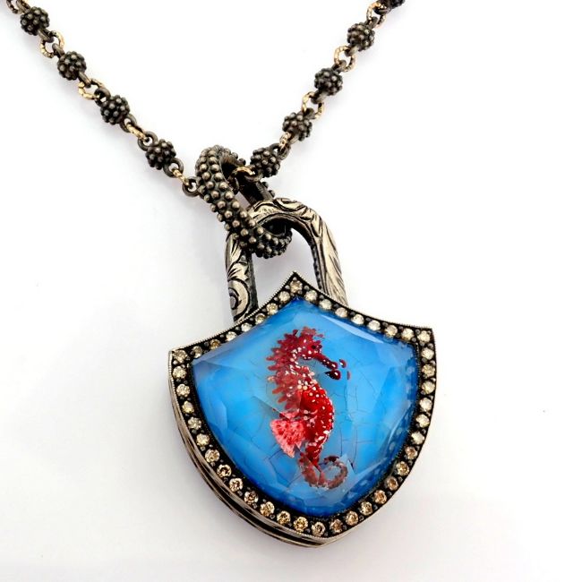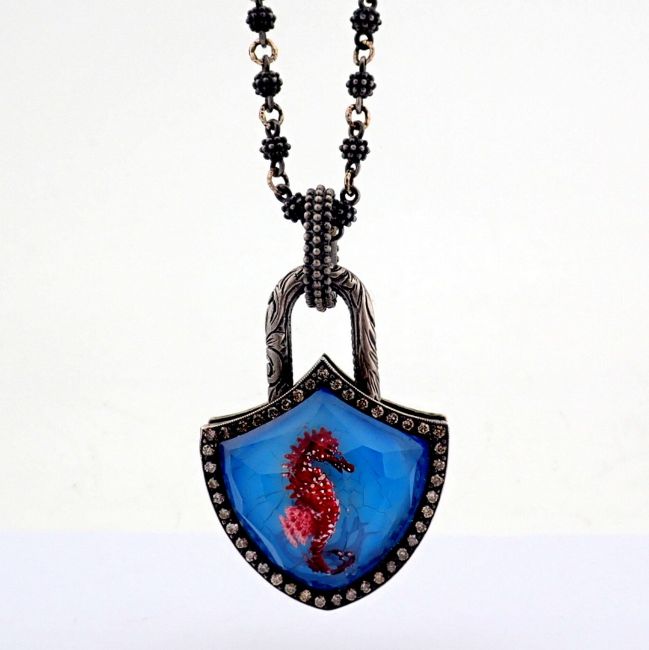 - An exquisite, convertible clasp necklace embellished with gold, topaz with reversely engraved intaglio sea horse and diamonds on silver- Hand Made Necklace- One Of Kind--------------------------------------------------