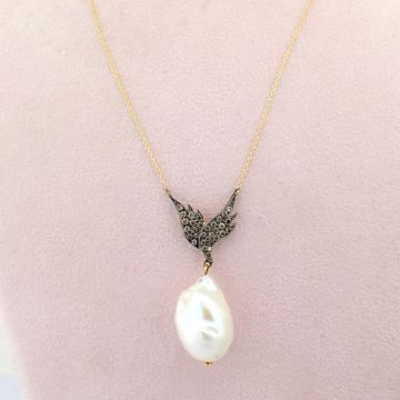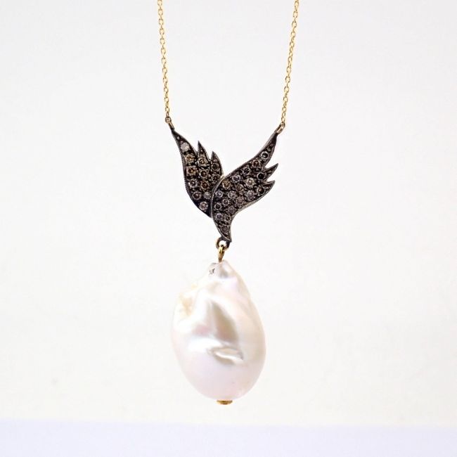 - An exquisite wing necklace detailed with baroque pearl , brilliant diamonds and gold on silver.--------------------------------------------------