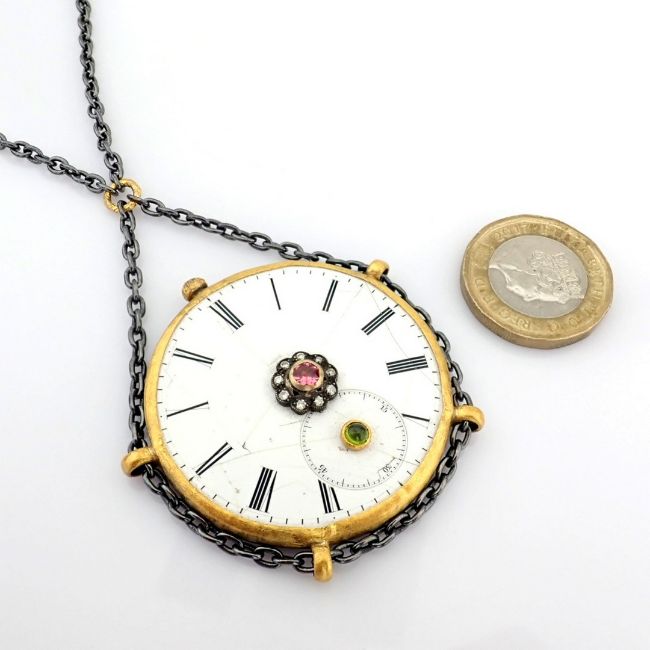 Title: Necklace made of gold and silver with antique watch dial with precious colourful stones and diamonds
