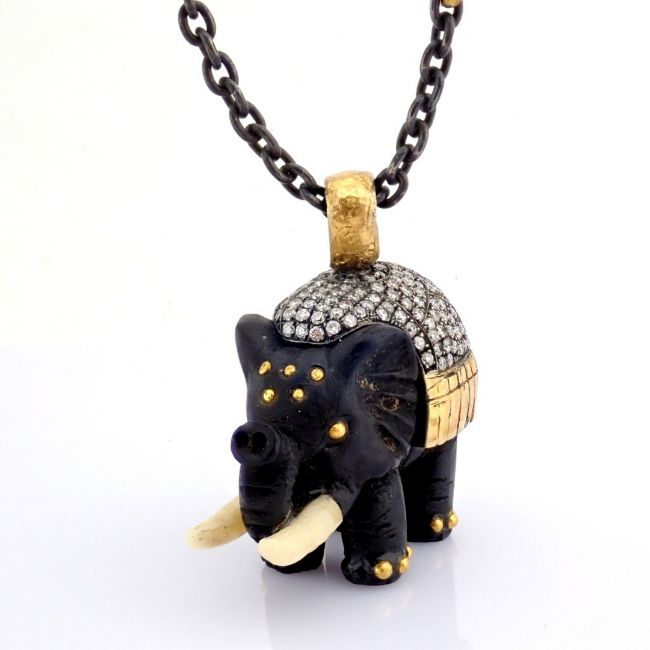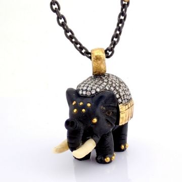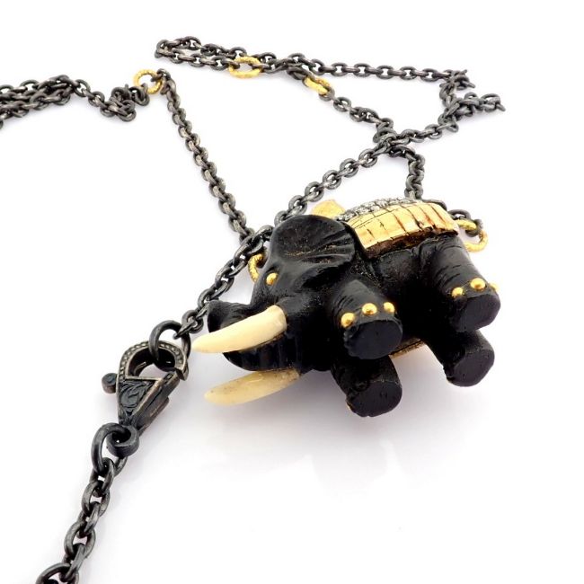- An ebony-carved elephant necklace intricately detailed with brilliant diamonds and gold on silver.- Hand Made Necklace- One Of Kind--------------------------------------------------