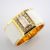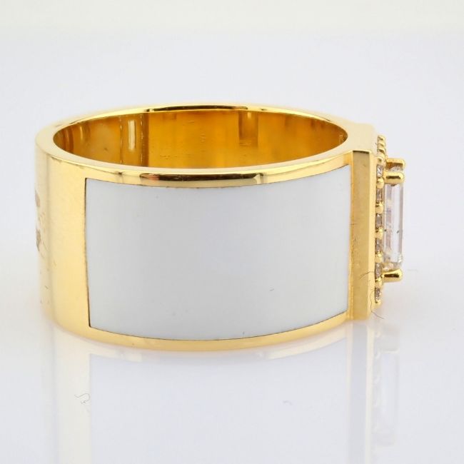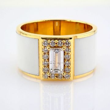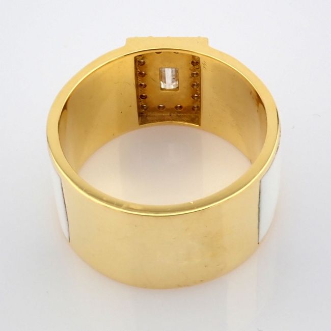 - 18K yellow gold ring featuring white laser enamel, elegantly adorned with brilliant diamonds.--------------------------------------------------