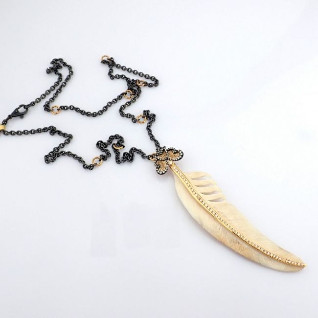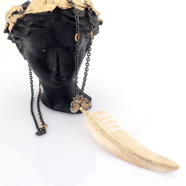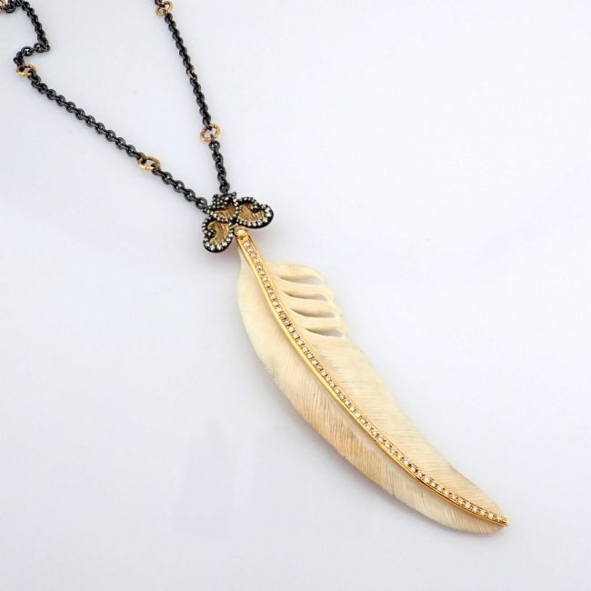 - An exquisite bone-carved feather necklace detailed with brilliant diamonds and gold on silver--------------------------------------------------