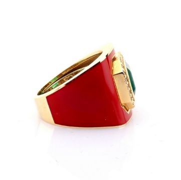 - A luxurious gold ring featuring red laser enamel, elegantly adorned with vibrant emerald and brilliant diamonds--------------------------------------------------