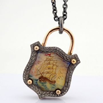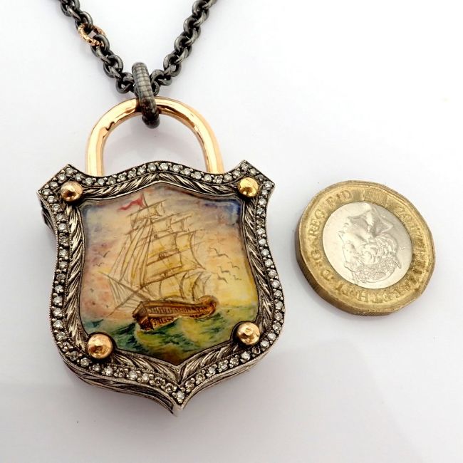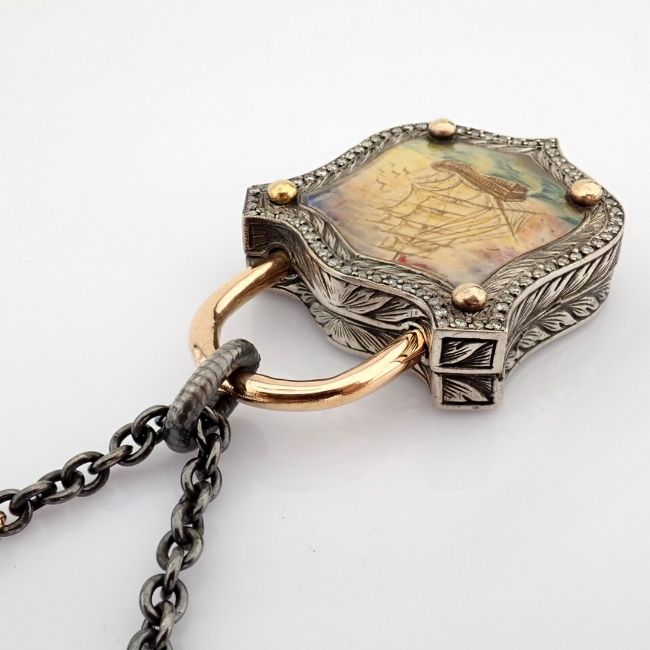 Title: Convertible clasp necklace embellished with gold, micro art, and diamonds on silver
