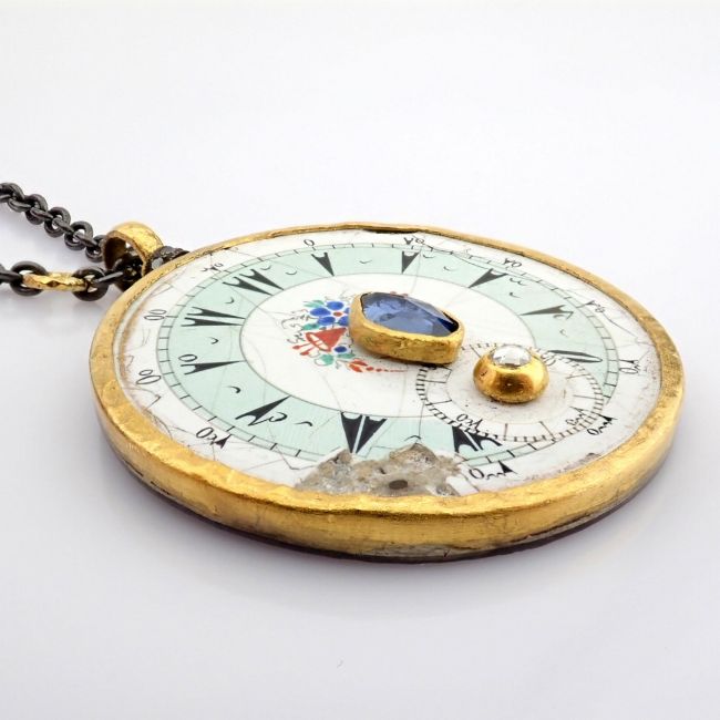 An exquisite necklace made of gold and silver, featuring an antique watch dial adorned with precious colourful stones and diamonds- Hand Made Necklace- One Of Kind--------------------------------------------------