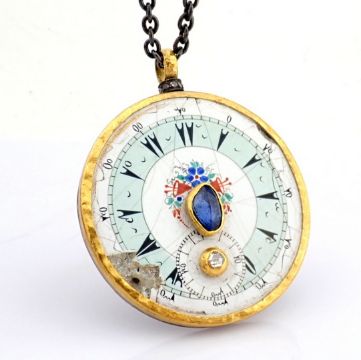 Title: Necklace made of gold and silver, with antique watch dial with precious colourful stones and diamonds