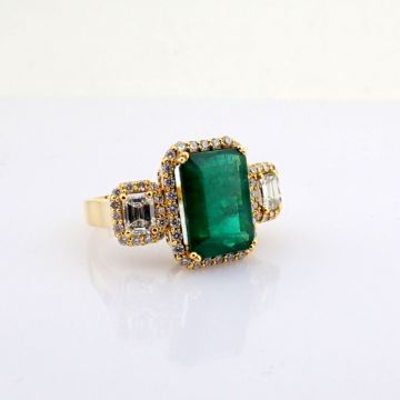 - 18K Yellow gold cluster ring detailed with vibrant emerald and baguette and brilliant diamonds--------------------------------------------------