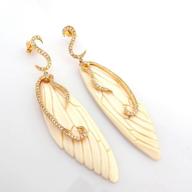 An exquisite bone-carved wing earrings detailed with brilliant diamonds and gold - One Of Kind--------------------------------------------------