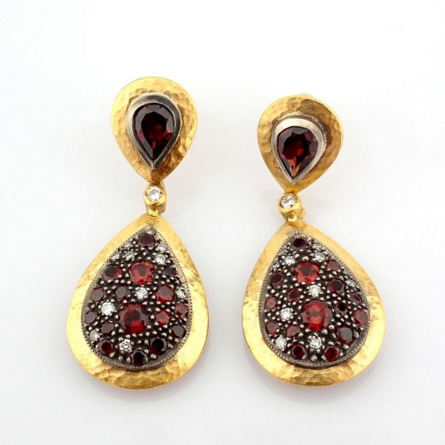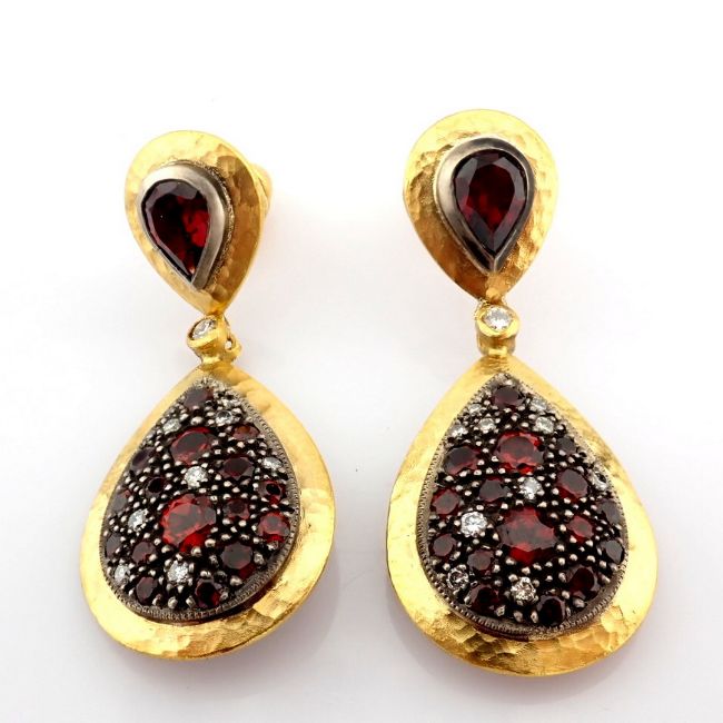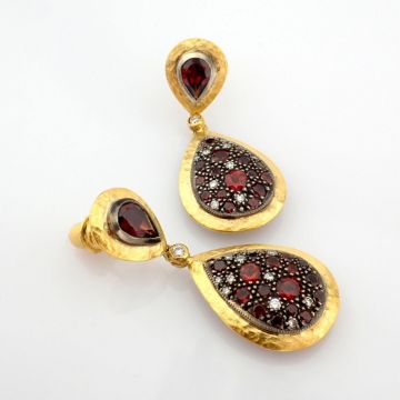Title: An exquisite earrings detailed with red garnets , brilliant diamonds and gold in silver