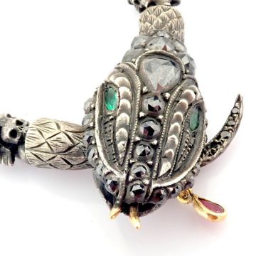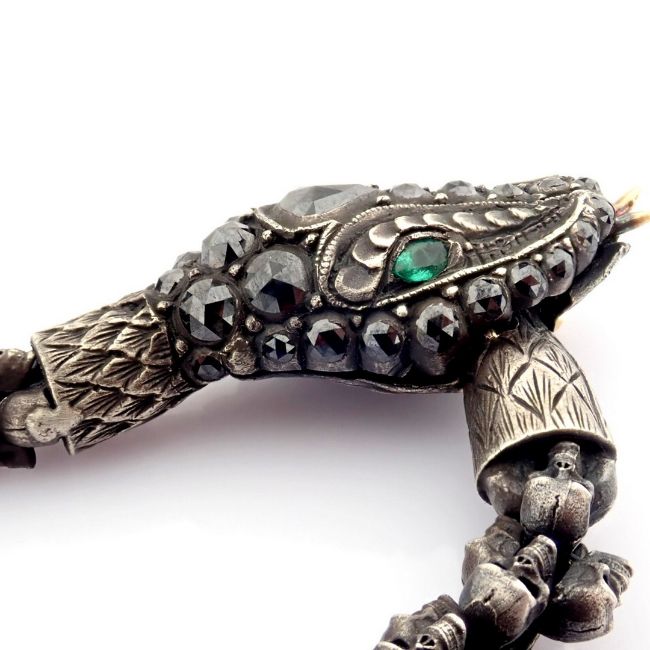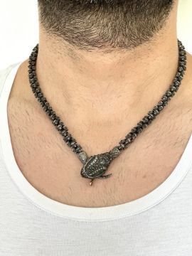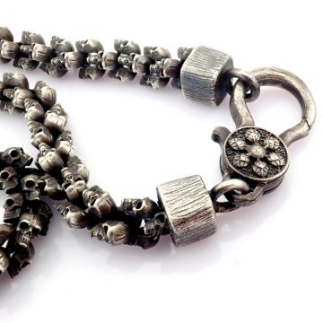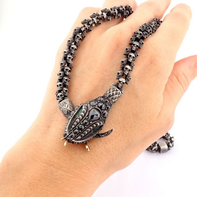 - An exquisite snake necklace intricately detailed with skulls on chain. Brilliant diamonds in silver- Hand Made Necklace- One Of Kind--------------------------------------------------
