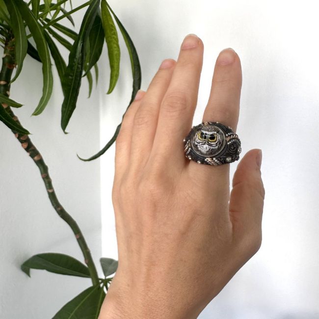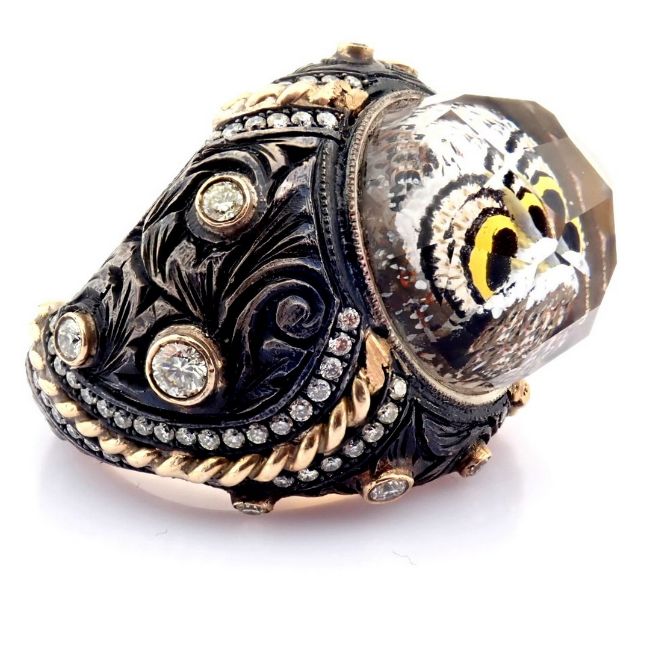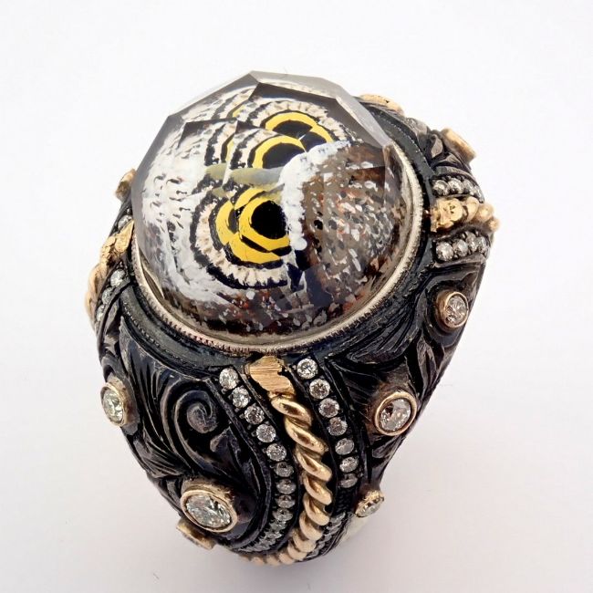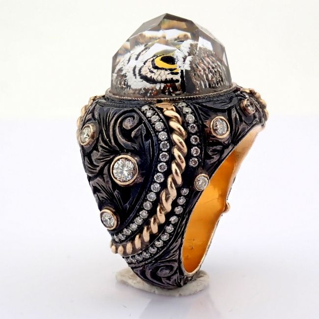 - An exquisite hand-made gold&silver ring. Detailed with topaz with reversely engraved intaglio owl and brilliant diamonds- Hand Made Ring- One Of Kind--------------------------------------------------