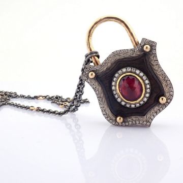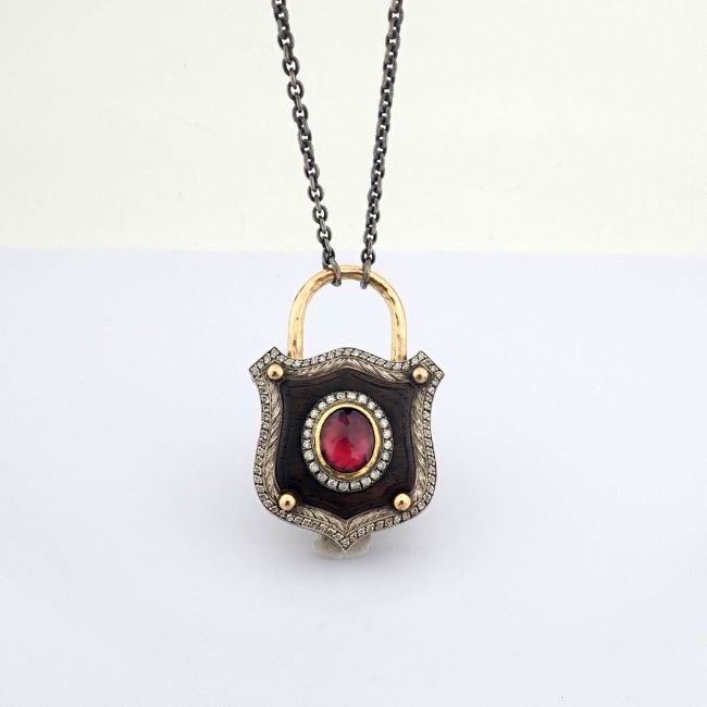 - An exquisite, convertible clasp necklace embellished with gold, vibrant tourmaline, ebony-carved and diamonds on silver- Hand Made Necklace- One Of Kind--------------------------------------------------