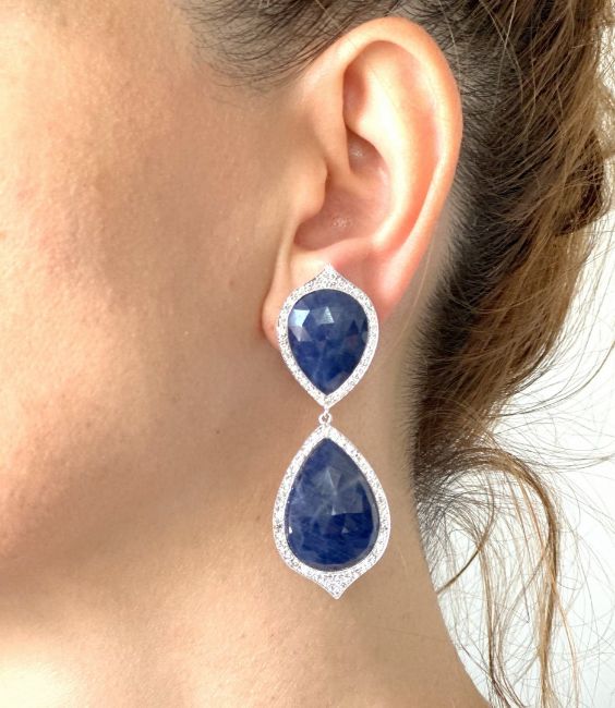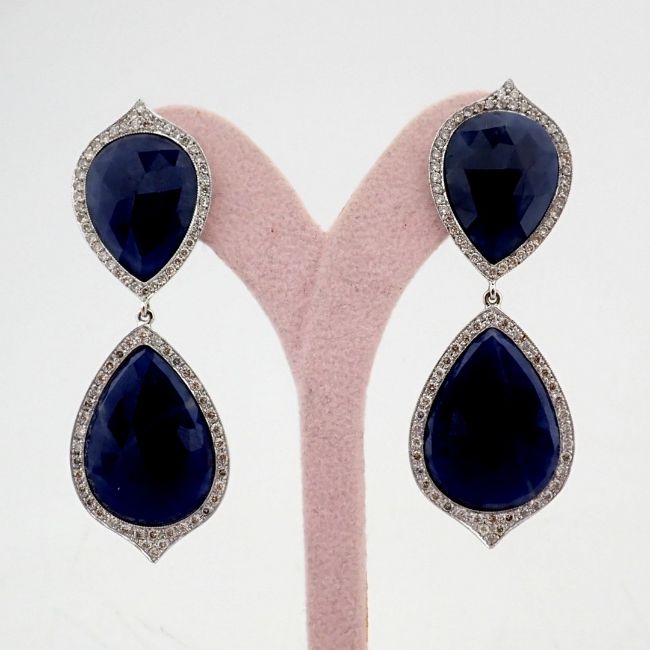 - 18K white gold earrings detailed with slice cut rough sapphire in the centres and brilliant diamonds on frames--------------------------------------------------