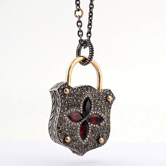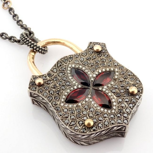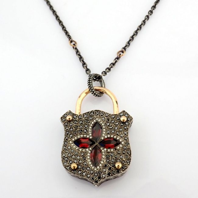 - STONES --------------------------------------------------- 0.29 ct H/SI Diamond- 1.69 ct Black Diamond- 4.8 ct Garnet--------------------------------------------------