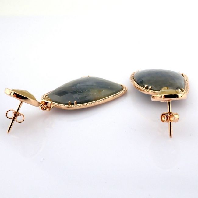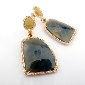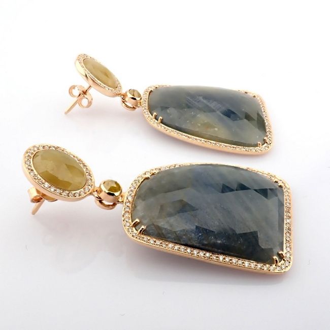 - An exquisite gold earrings detailed with slice cut rough sapphire in the centre and brilliant diamonds on frame--------------------------------------------------