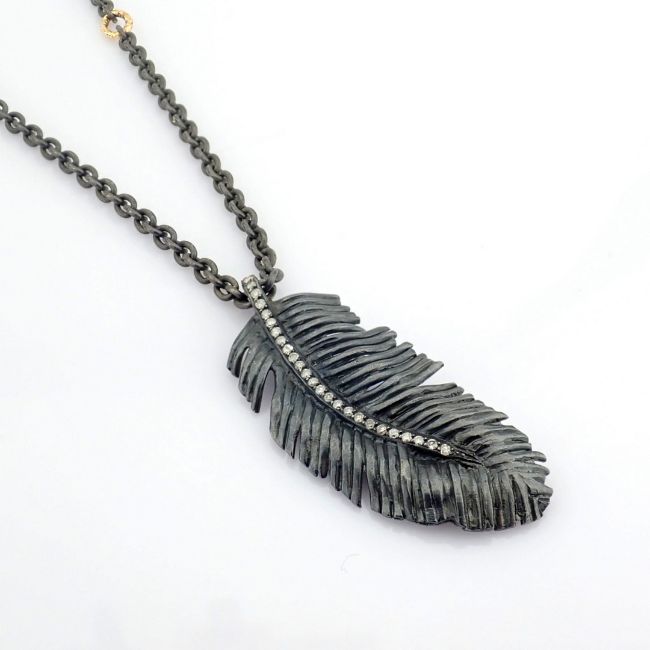An exquisite feather necklace detailed with brilliant diamonds and gold on silver.--------------------------------------------------