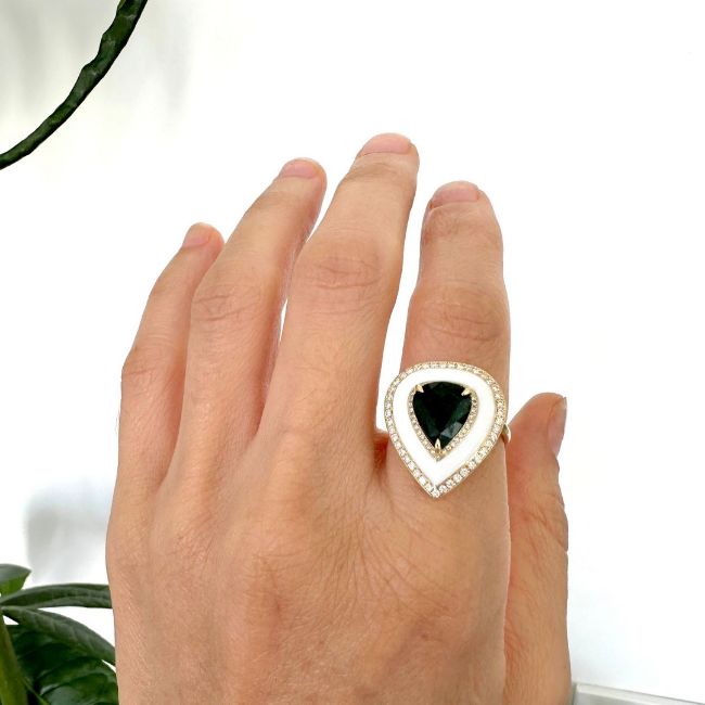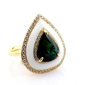 A luxurious gold ring featuring white laser enamel, elegantly adorned with vibrant Emerald and brilliant diamonds.--------------------------------------------------