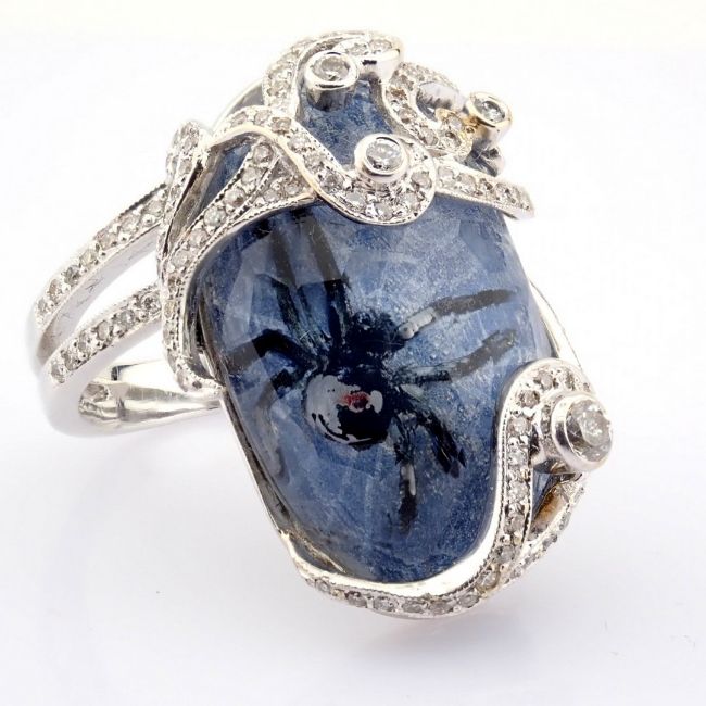 - An exquisite handmade gold ring intricately detailed with topaz, featuring a reverse-engraved intaglio spider and brilliant diamonds--------------------------------------------------