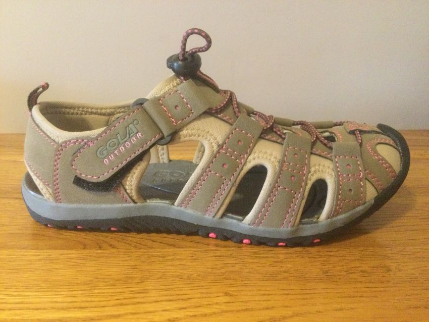 The New Gola “Shingle 3” is a closed toe trekking sandal, Durable synthetic suede upper and  Soft stretch woven linings provide additional comfort.  The sandals have Side velcro and elastic lace and toggle fastening offering a quick and secure fit. The Open side panels ensure your feet remain cool and the Custom fit anatomically designed moulded eva footbed gives comfort and cushioning.  Low profile lightweight streamlined lugged tpr sole unit provides flexibility durability and traction
