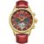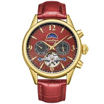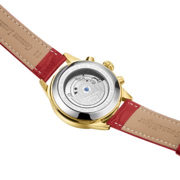 The timepiece is powered by an intricate 210 Part 20 Jewel Hand Assembled Automatic Movement that pays tribute to the careful considerations of astronomical study during the 18th century. Its dawn red dial is detailed with stars, and the open exhibition provides an intriguing window. Balanced at the 3 and 9 markers, the Day and Date counters complete the watch.