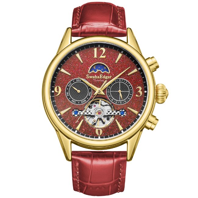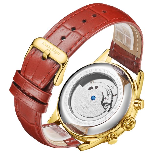The morning-red leather strap helps the gold IP case stand out with the vibrance of the sun’s ring of fire during a total eclipse. The Swan & Edgar logo-engraved stainless steel caseback completes the piece and adds to the sophistication expected of England’s finest scholars.