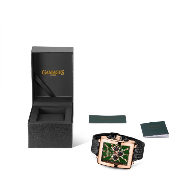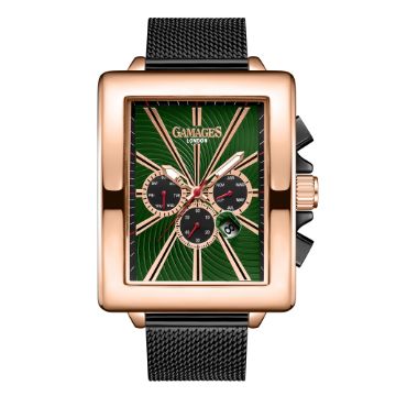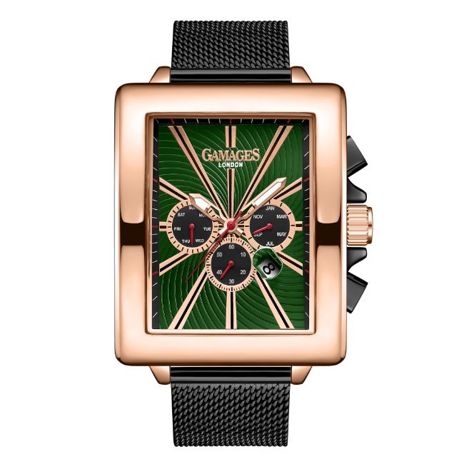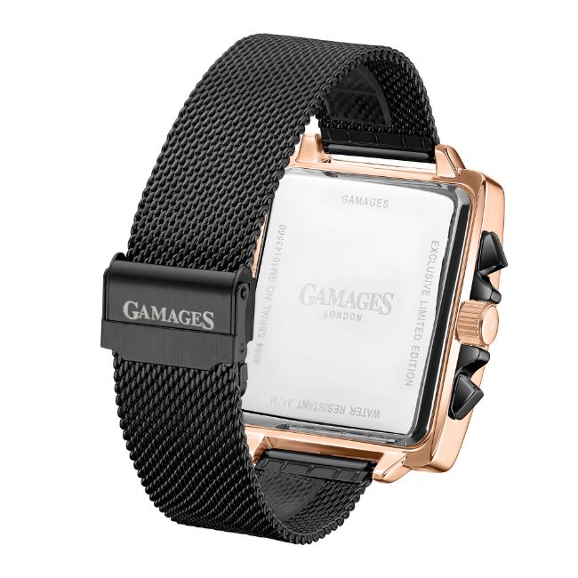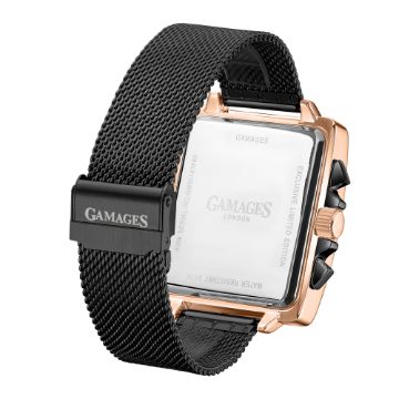 The ink-black stainless steel Milanese bracelet contracts with the rose gold stainless steel case to complete the timepiece, bringing a dutiful elegance, and serves as a dependable means to enhance one’s reputation.