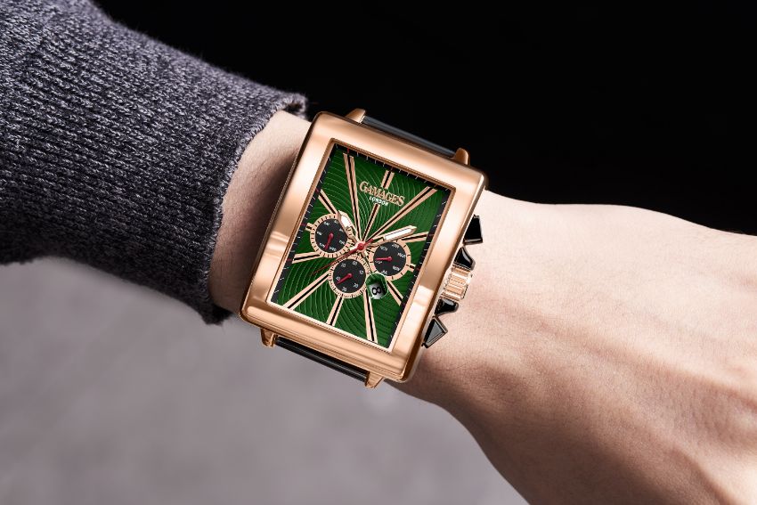 The 210 Part 20 Jewel Automatic Movement operates the luminous hands that gracefully glide across indices. At the six position, the exhibition detail allows you to peer briefly behind the curtain, offering a taste of what the timepiece can do. This is flanked by additional counters and a Date window that are arranged across a polo-green dial.