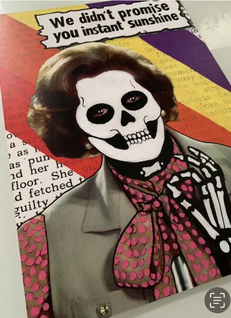 Features Margaret Thatcher skull image with quote.