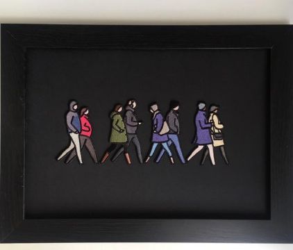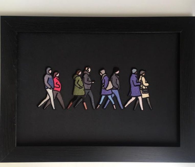 London Couples reflect this, with its 2 dimensional depth and embroidered walking images contained within a frame.