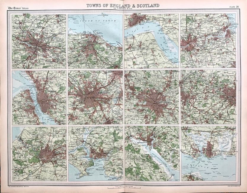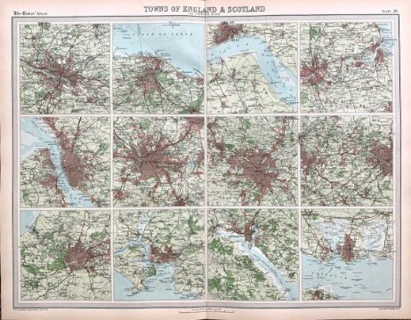 Title: Antique Bartholomew Large Coloured Map 12 Cities of England and Scotland.
