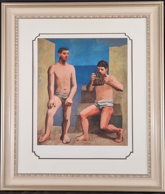 Composed in 1923, whilst on holiday in Antibes, France, The Pipes of Pan is the crowning achievement of Picasso's neoclassical period of the 1920s. The Pipes of Pan is regarded as the most important painting of this period, not only because of its theme, but also because it draws upon classical interpretations of art in a new and modern style. This monumental painting depicts a mythological scene, set in the Mediterranean, in which two classical figures stare out towards a lost Arcadia, Pans homeland. The figures are heavy, sculptural and contemplative. In the painting Picasso transforms Pan, the ancient Greek god of shepherds and flocks who has the hind legs and horns of a goat, into a young boy. Picasso's Pan reveals none of the laziness or lustiness of the original Greek god. The origins of Pans pipes lie in the ancient Greek tale of Syrinx, who was pursued by the amorous Pan and chased into a river, whereby she turned into a hollow reed. Pan then cut the reeds and fashioned them into the first musical pipes. Throughout Picasso's many periods of transition, he would often refer to various mythological figures, one of the most famous being the Minotaur. Yet Picasso was not primarily concerned with the old myths but rather by their transformation into modern 20th century art.