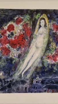 "Bride with Flowers" was painted by Chagall in 1960. Dating towards the very end of his active artistic life, it is a fine example of Chagall's work, embracing many of his familiar themes of love and marriage, fantasy, space and urban skylines.