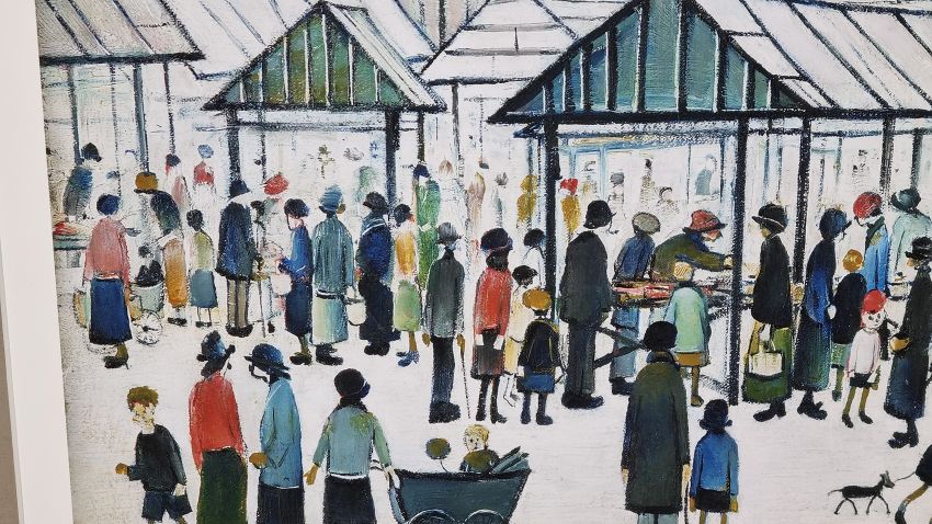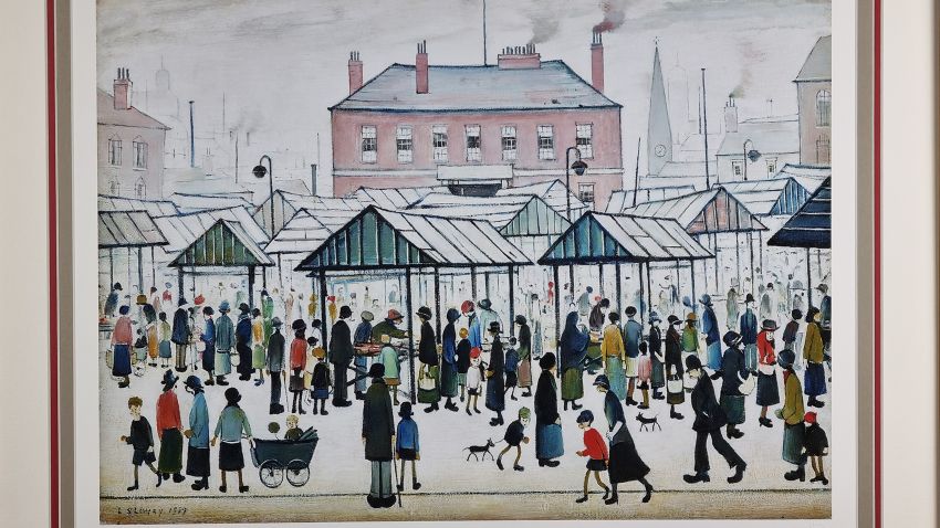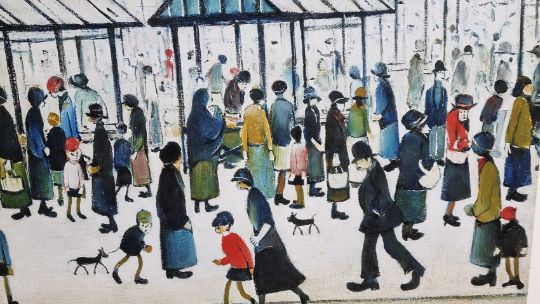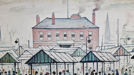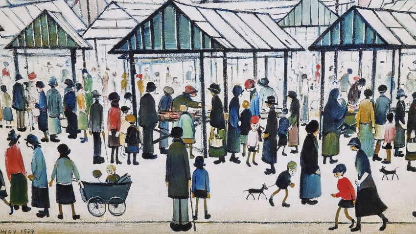 Lowry's painting of 'Market Scene, Northern Town' was painted in 1939. Lowry is renowned for his images of busy urban landscapes of northern towns with figurework often referred to as 'matchstick men'. This painting is of Pendlebury Market in Salford that was near to Lowry's home. The large crowd includes people from all walks of life, from families to businessmen, suggesting that Lowry captured the market on a busy Saturday.