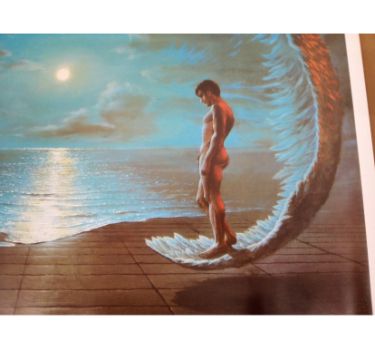 The artwork features two nude figures, a man and a woman, set against a dramatic coastal backdrop.