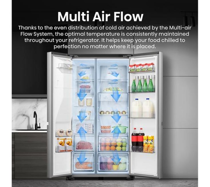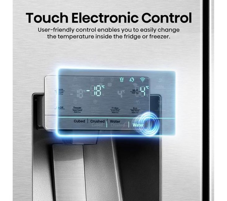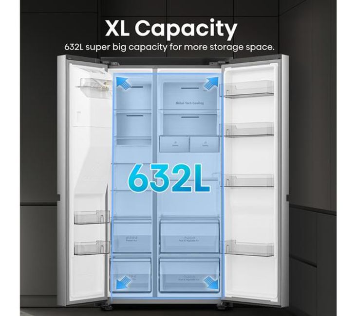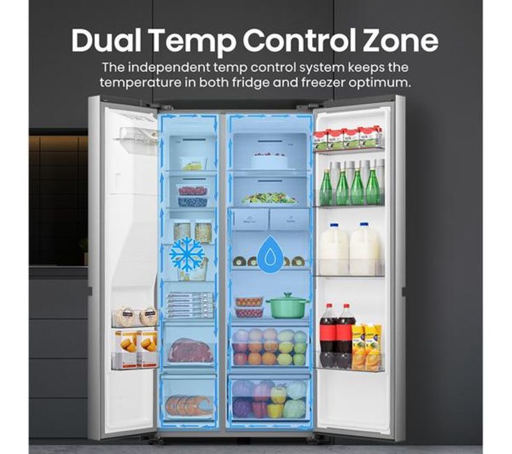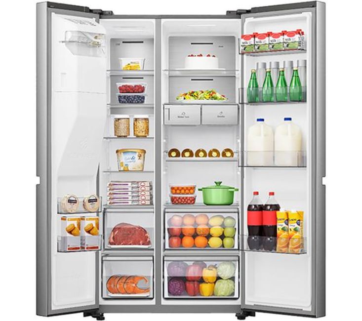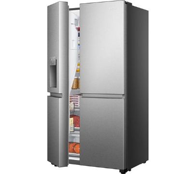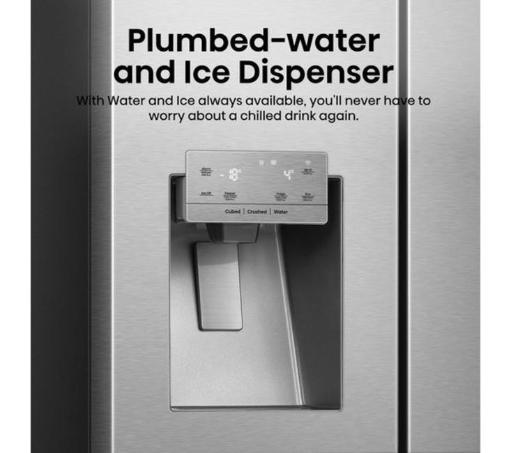 Struggling to fit everything in after the weekly food shop? This Hisense American-style fridge freezer has got you covered with its whopping 632 litre capacity - that's roughly 35 bags of groceries. There's a 4.5 litre water dispenser so you can enjoy cool, crisp water any time. It even makes crushed ice – perfect for those cheeky cocktails in the summer months. And Total No Frost technology evenly distributes cold air and stops ice and water building up. It means you'll never have to manually defrost it. Ever!