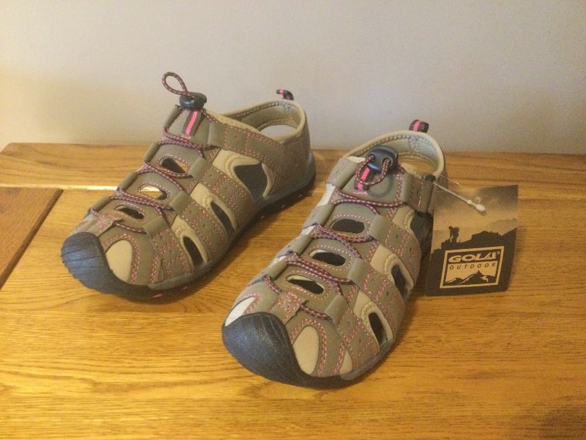 The New Gola ÒShingle 3Ó is a closed toe trekking sandal, Durable synthetic suede upper and Soft stretch woven linings provide additional comfort. The sandals have Side velcro and elastic lace and toggle fastening offering a quick and secure fit. The Open side panels ensure your feet remain cool and the Custom fit anatomically designed moulded eva footbed gives comfort and cushioning. Low profile lightweight streamlined lugged tpr sole unit provides flexibility durability and traction