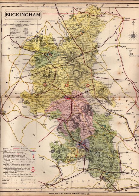 County of Buckinghamshire Large Victorian Letts 1884 Antique Coloured Map.