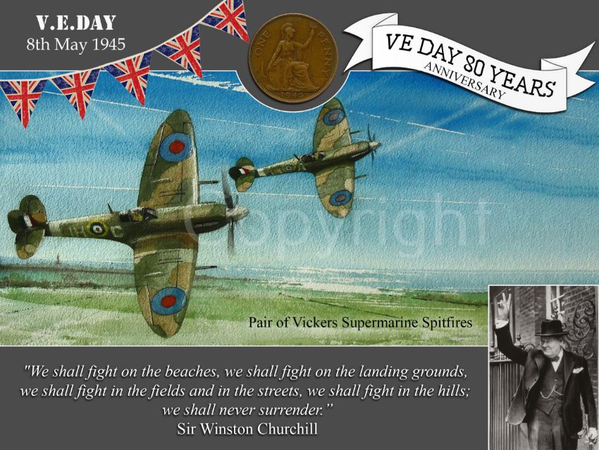 Title: VE Day 80th Anniversary Designed Metal Art Coin Display Hawker Supermarine Spitfire