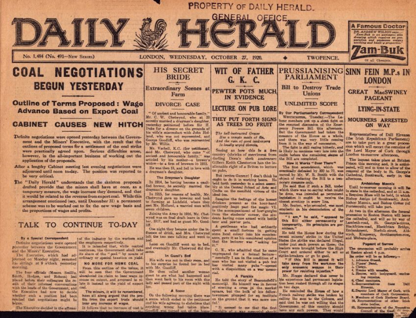 An Original Antique  Broadsheet Newspaper Page from The London Daily Herald 1920.