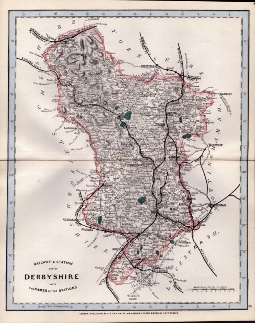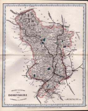 Title: Derbyshire Cruchley Scarce Antique Railways & Stations 160 Years-Old Coloured Map.
