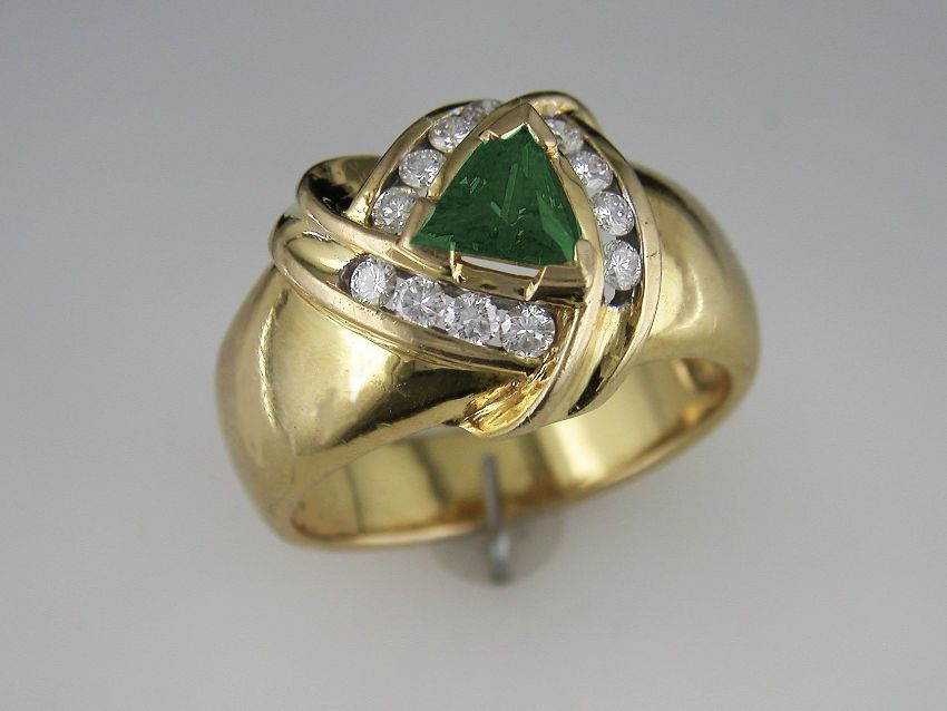 The Central Trillion cut Green Tourmaline is 7 mm x 7 mm and equates to 1.5 carats and is a rich deep green.