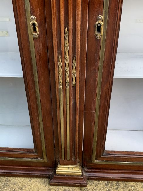 A truly exceptional example of Victorian craftsmanship, mahogany and brass-mounted wall-hanging display cabinet exudes the elegance and sophistication of a bygone era.