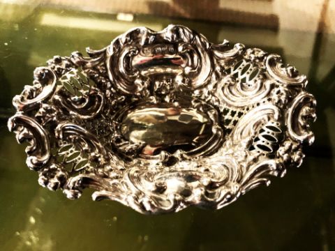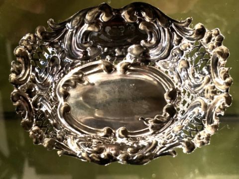 The dish is beautifully chased and embossed with a delicate floral motif, creating a visually appealing and elegant piece.
